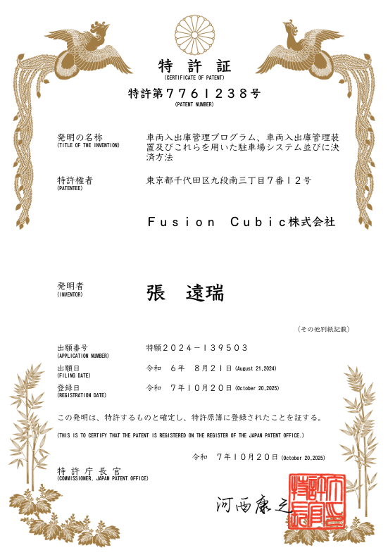 この度弊社が出願しておりました「車両入出庫管理プログラム、車両入出庫管理装置及びこれらを用いた駐車場システム並びに決済方法」について、特許申請が受理され、今回特許取得致しましたことをお知らせいたします。