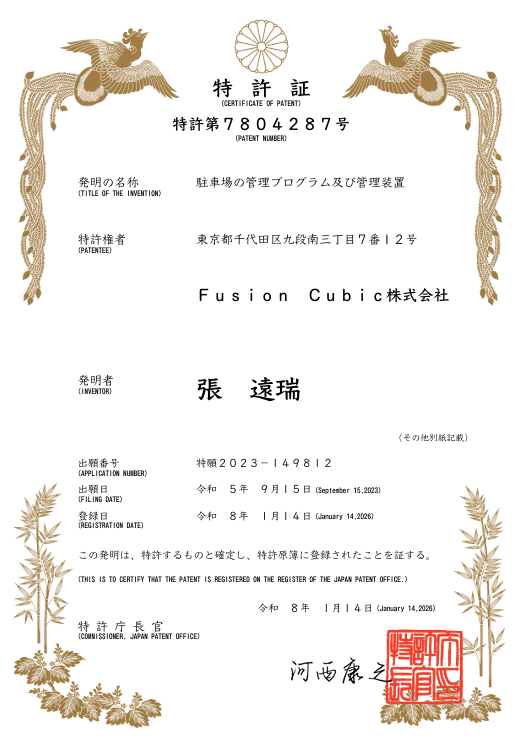この度弊社が出願しておりました「駐車場の管理プログラム及び管理装置」について、特許申請が受理され、今回特許取得致しましたことをお知らせいたします。